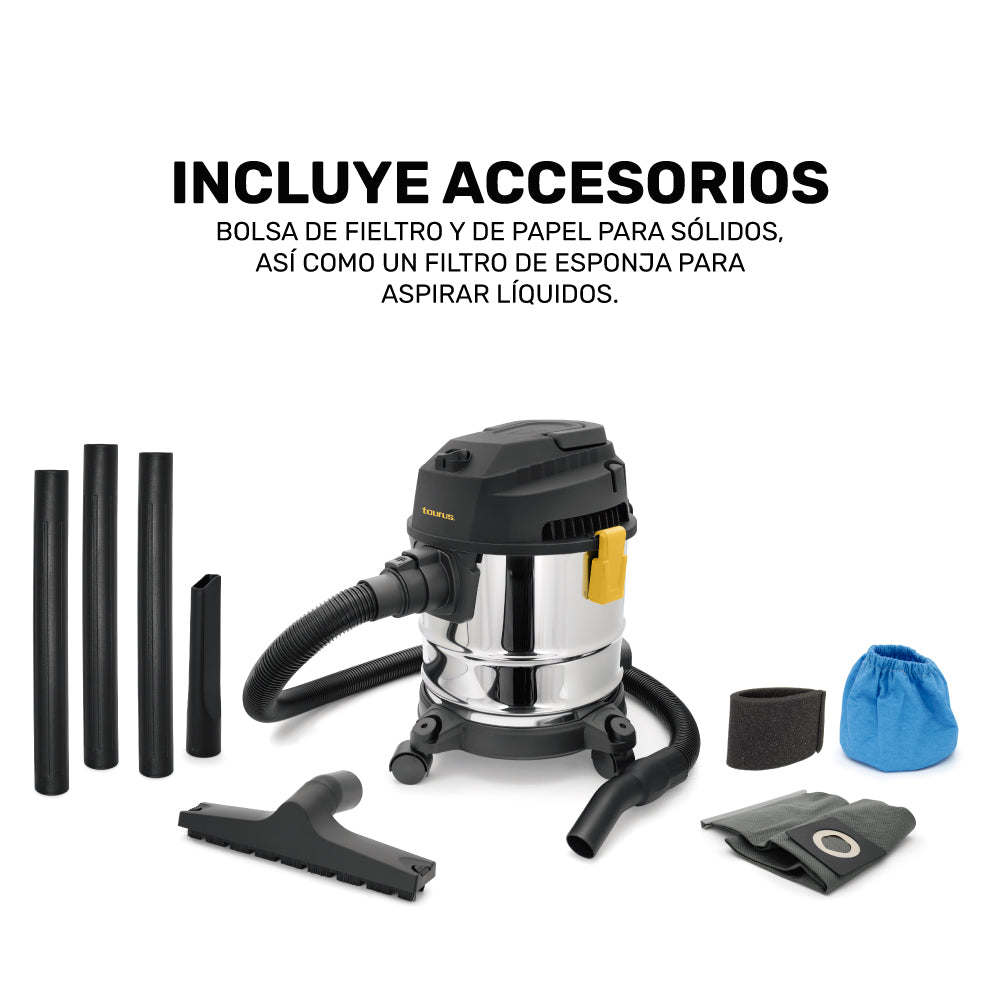 Aspiradora TEMPEST 3 en 1: diseñada para aspirar sólidos, líquidos y funcionar como expulsor de aire. Con una capacidad de 3,1 galones (12L) y 14 KPa de succión, ofrece potencia y rendimiento superior. Cuenta con ruedas 360º para fácil movilidad, manguera flexible de 1,2 m y cable de 2,5 m para mayor alcance. Incluye accesorios para pisos, alfombras, sillones y esquinas difíciles, además de filtros y bolsas para sólidos. Su protección térmica evita el sobrecalentamiento, garantizando seguridad y durabilidad. ¡La solución integral para una limpieza eficiente!