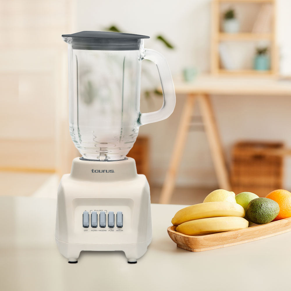 GRANITE ECO de TAURUS combina potencia y funcionalidad con sus 350 Watts y 4 velocidades (2 continuas y 2 pulsos). Perfecta para preparar cremas, salsas y smoothies, su jarra de vidrio de 1.25 litros evita la mezcla de olores y sabores. El sistema Easy Fit asegura la jarra, alargando la vida útil de la licuadora. Incluye tapa de cierre hermético con tapón dosificador. Sus cuchillas eficientes garantizan una preparación rápida. Compatible con el jarro chopper de Taurus, reduce la huella de carbono con 50% menos plástico gracias a plásticos biológicos.