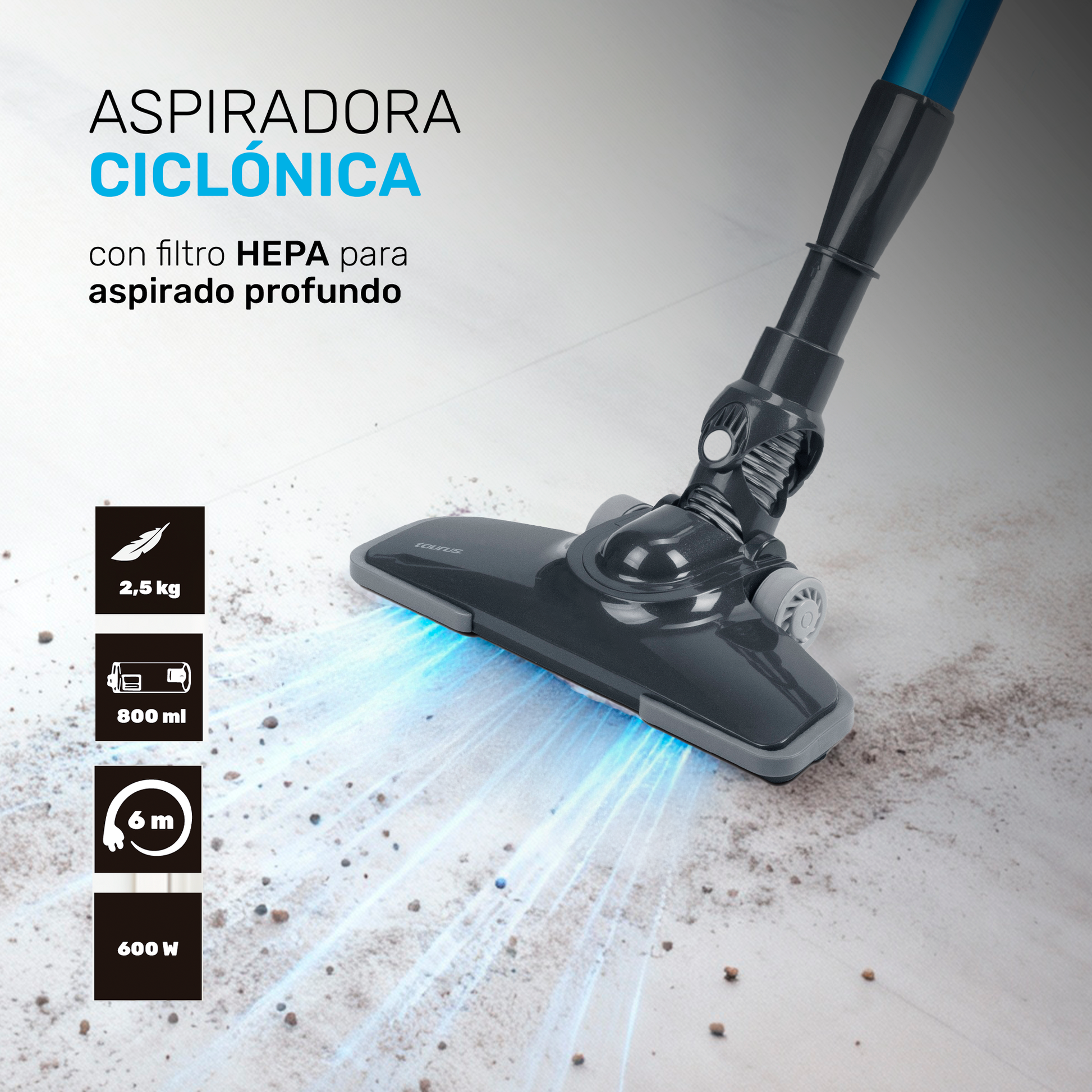 Gracias a su tecnología ciclónica y su triple sistema de filtrado (ciclónico, prefiltro metálico y filtro HEPA), captura polvo fino, ácaros y alérgenos, dejando un aire más limpio y fresco en tu hogar. Con solo 2.5 kg, podrás moverla por toda la casa sin cansarte, mientras su cable de 6 metros facilita limpiar más área sin detenerte.