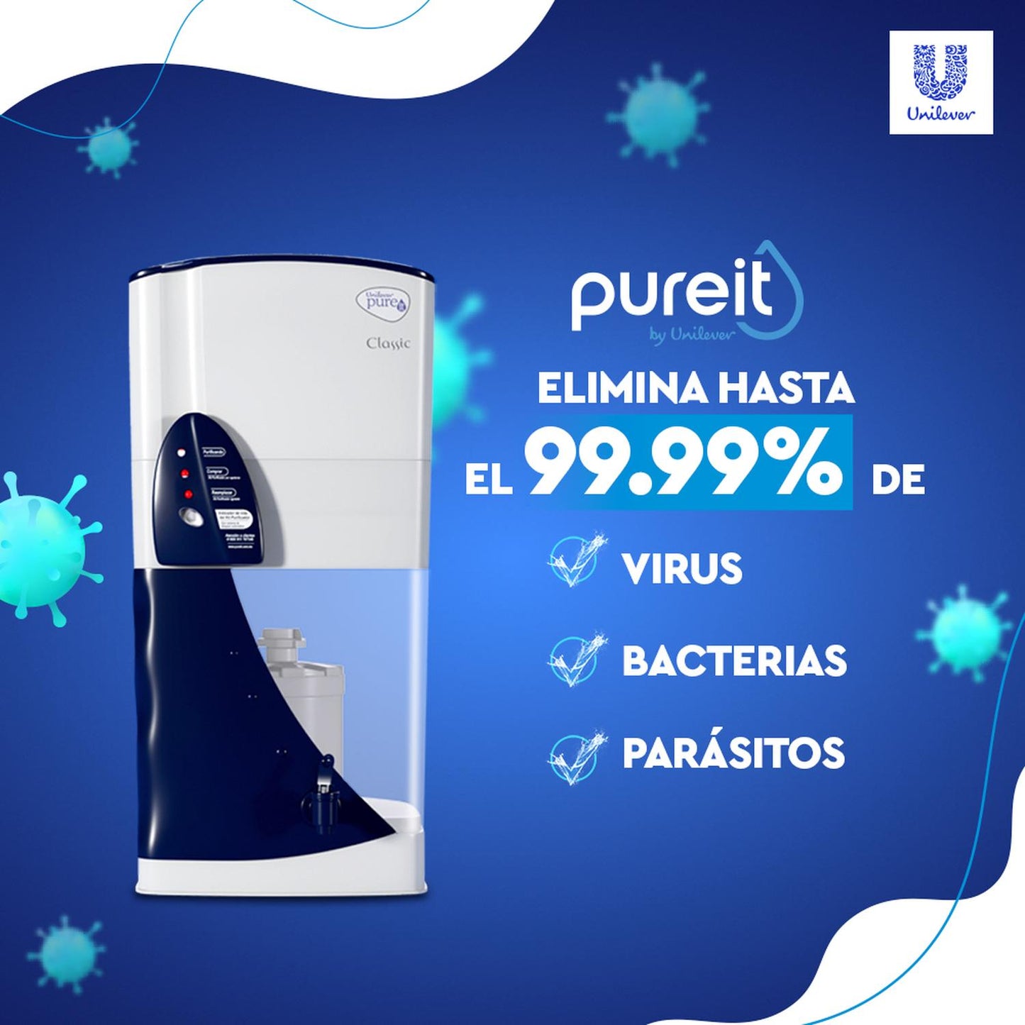 El purificador de agua PUREIT es ideal para toda la familia, convierte el agua recién salida de la llave en agua limpia y segura para beber. Gracias a su gran tecnología patentada, purifica el agua en cuestión de minutos. Además, resulta muy sencillo de usar, solo tienes que vaciar agua una vez al día o cada que sea necesario y ¡listo!, PUREIT se encargará del resto, proporcionandote agua libre de virus y bacterias. Con PURE IT no dependeras más de los garrafones y cuidarás del medio ambiente. Los beneficios que PUREIT proporciona son: Remueve partículas visibles, Elimina pesticidas y parásitos, Elimina virus y bacterias y deja el agua cristalina, sin olor y con un sabor natural.